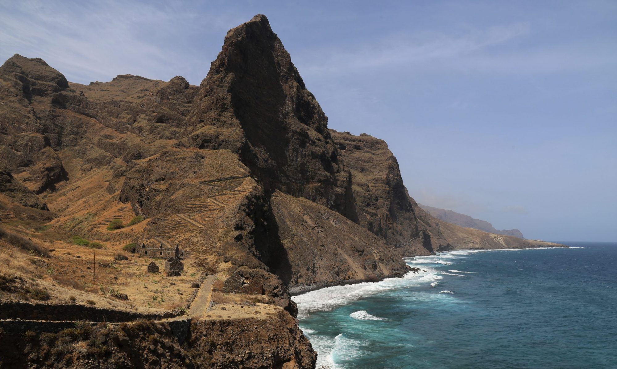 Commençons par chasser une idée reçue : au Cap-Vert, tous les paysages ne sont pasblottis dans leur écrin de verdure. La ligne de partage des eaux est sélective, lesprécipitations capricieuses. L’archipel se situe à 800 km environ des côtes africaines,au large du Sénégal et de la Mauritanie. Il est composé de 10 îles dont 9 sonthabitées. Au Nord, ce sont les îles au vent avec notamment Santo Antão et Sao Vicente. C’est en montant dès les premiers mètres que l’on comprend Santo Antão. Nulle part ailleurs dans l’archipel, on ne trouve autant de ces chemins muletiers suspendus entre ciel et mer et qui relient les hommes entre eux. Partout des terrasses cultivées et des maisons habitées au milieu des bananiers, manguiers et cannes à sucre. De l’autre coté de l’île, les volcans sommeillent sous 2000 m d’altitude. Au bord de mer, tous les hommes pêchent, il s’agit tout simplement d’assurer le manger et comme on va le voir, du poisson, il y en a… Agriculture et pêche traditionnelles, c’est un système encore très actuel qui fait le charme de ces îles un peu loin du monde.